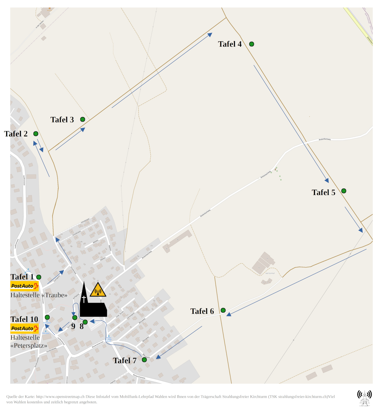 Alle Standorte der Infotafeln sind auf folgender Karte (PDF) festgehalten: Karte Mobilfunklehrpfad-Wahlen.pdf